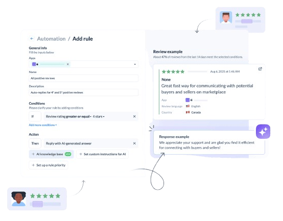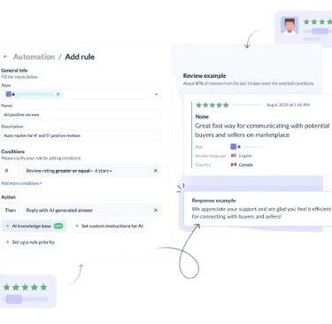 Let AI-powered automation handle routine responses while your team focuses on complex issues. Quickly answer app reviews using filters, report spam and offensive reviews, and measure team effectiveness with agent performance metrics. Let AI write replies that sound like your company and drive engagement