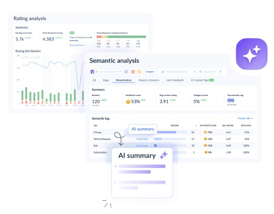 Easily gather user feedback from both your apps and competitors. See user sentiment at scale with AI semantic analysis, smart tags, and analytics dashboards.